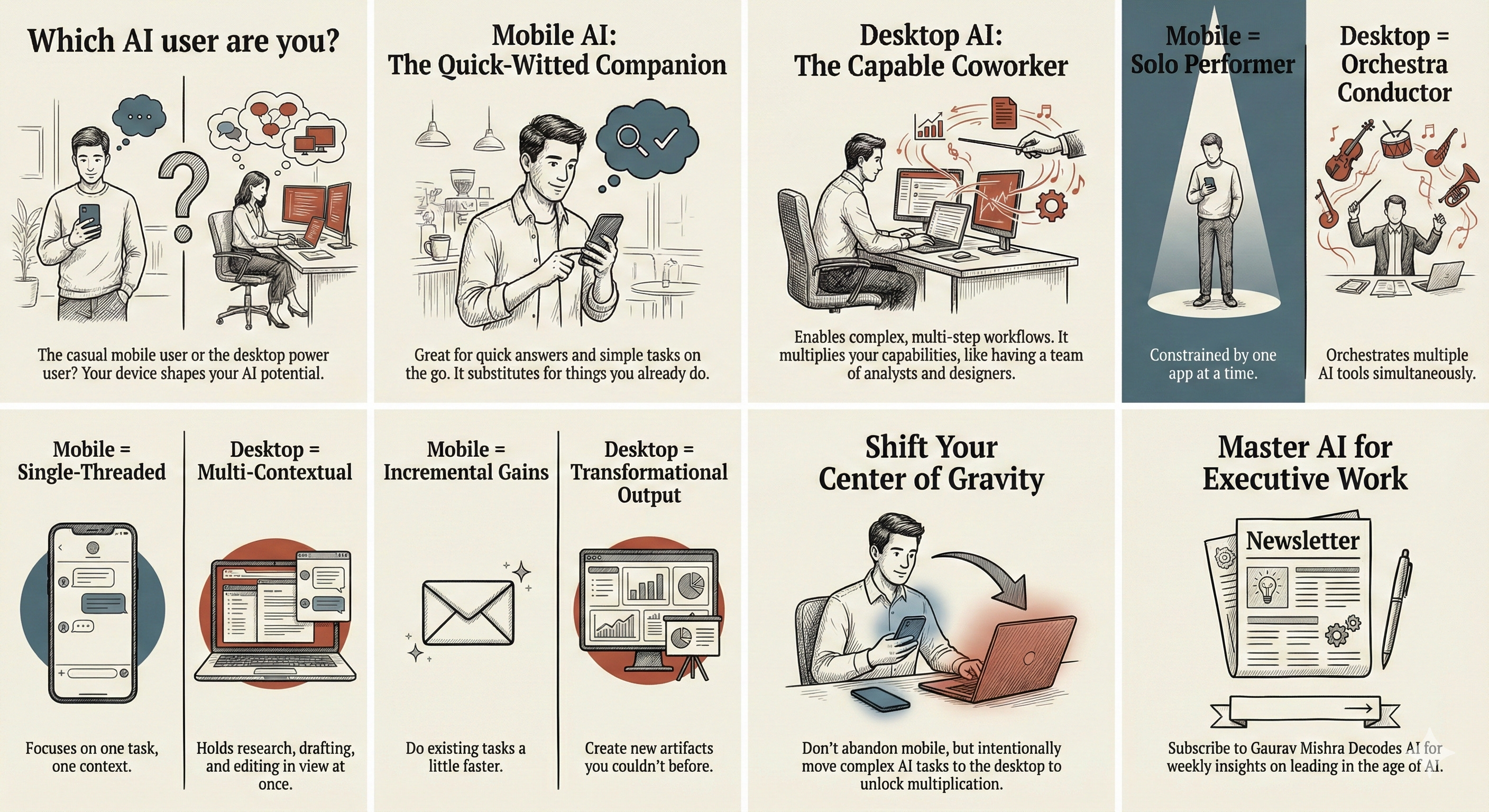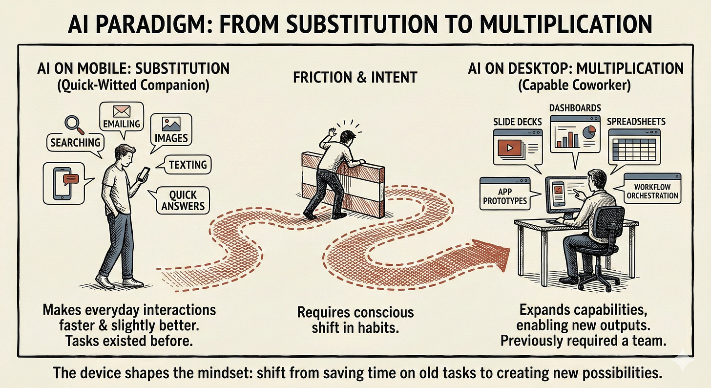 AI on mobile mostly substitutes for things we already do on phones (searching, emailing, texting), while AI on desktop adds capabilities that used to require other people (analysts, designers, developers).